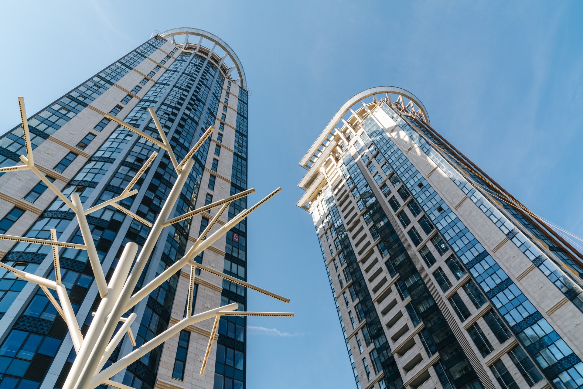- Здания венчают «короны» –конструкции весом около 88 тонн каждая
