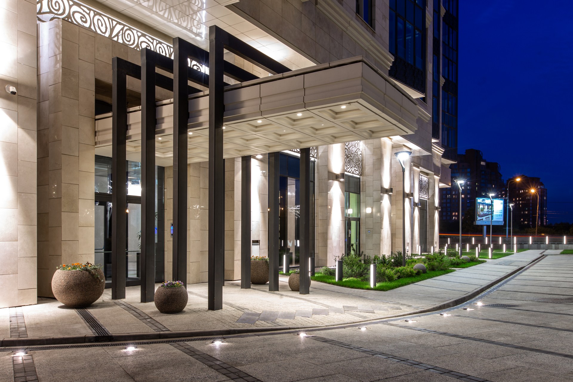 - Архитектурная подсветка верхних «корон» дома и витражей входных групп