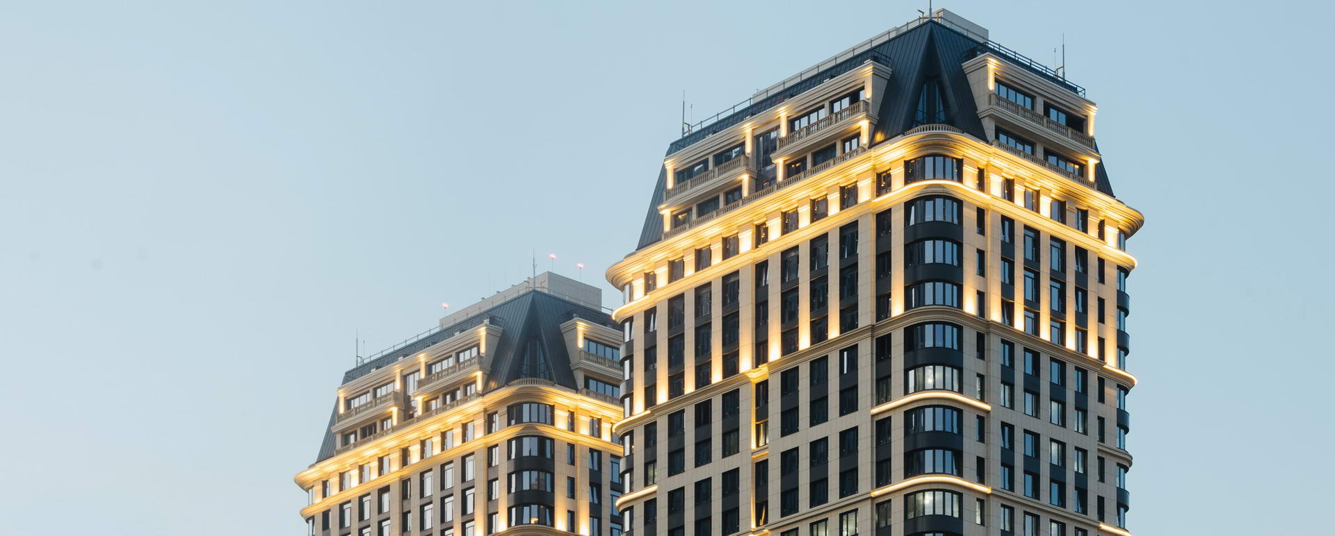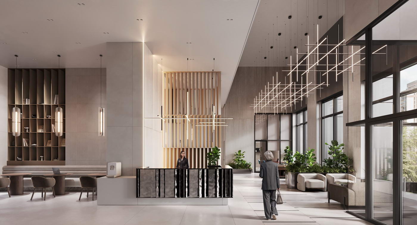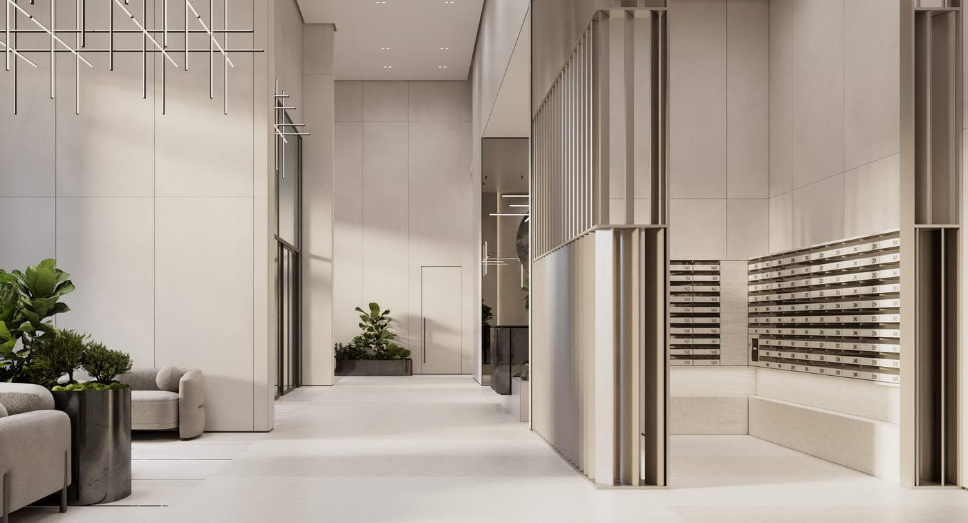 - Двусветные парадные лобби с авторским дизайном и мягкими зонами ожидания