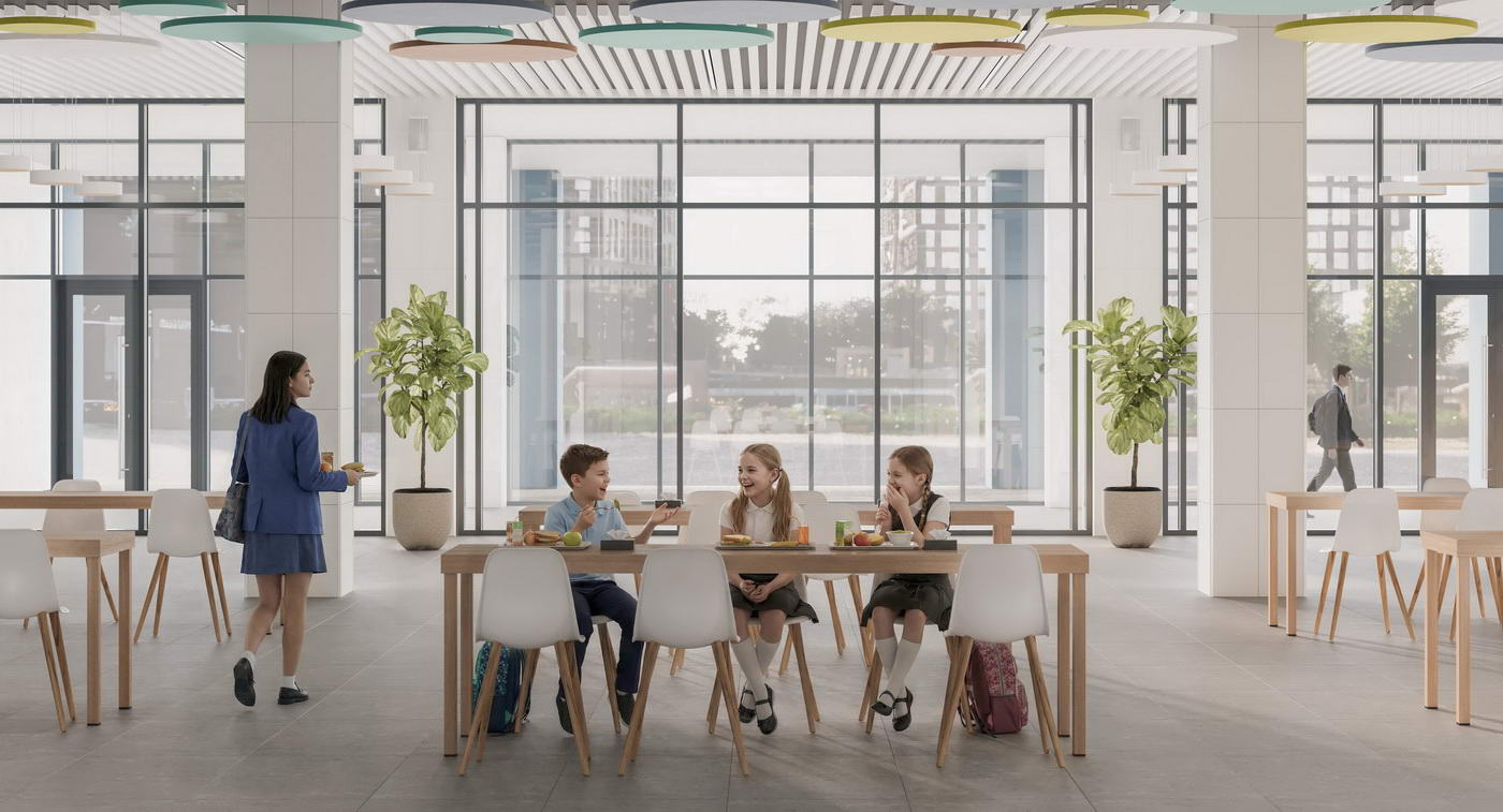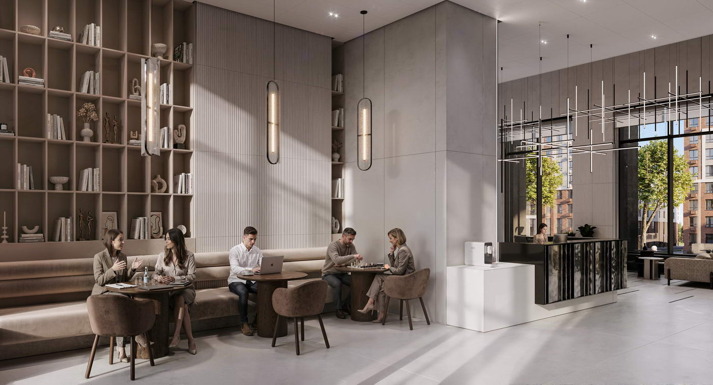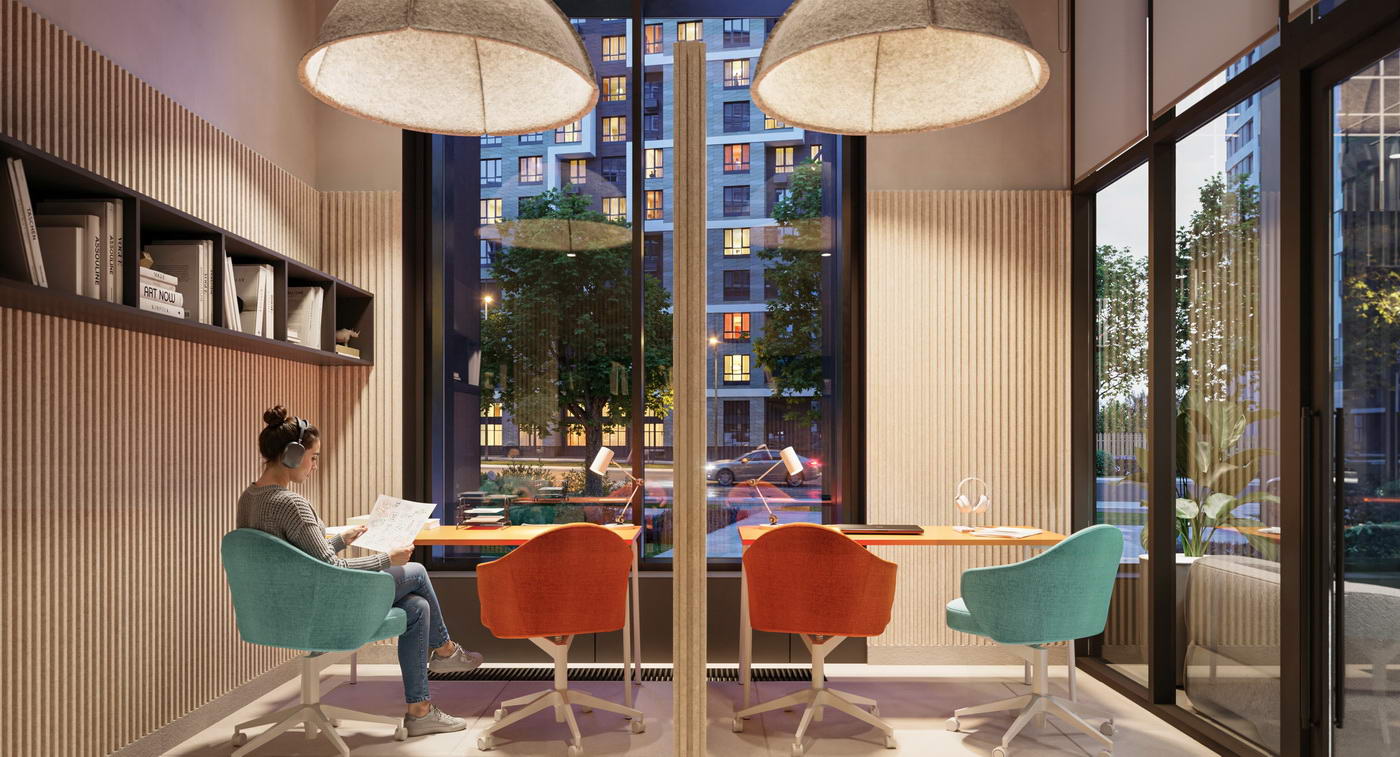 - Разнообразие общественных пространств для жителей любого возраста: детская игровая, репетиторские, лаунжи, коворкинг, спортрум